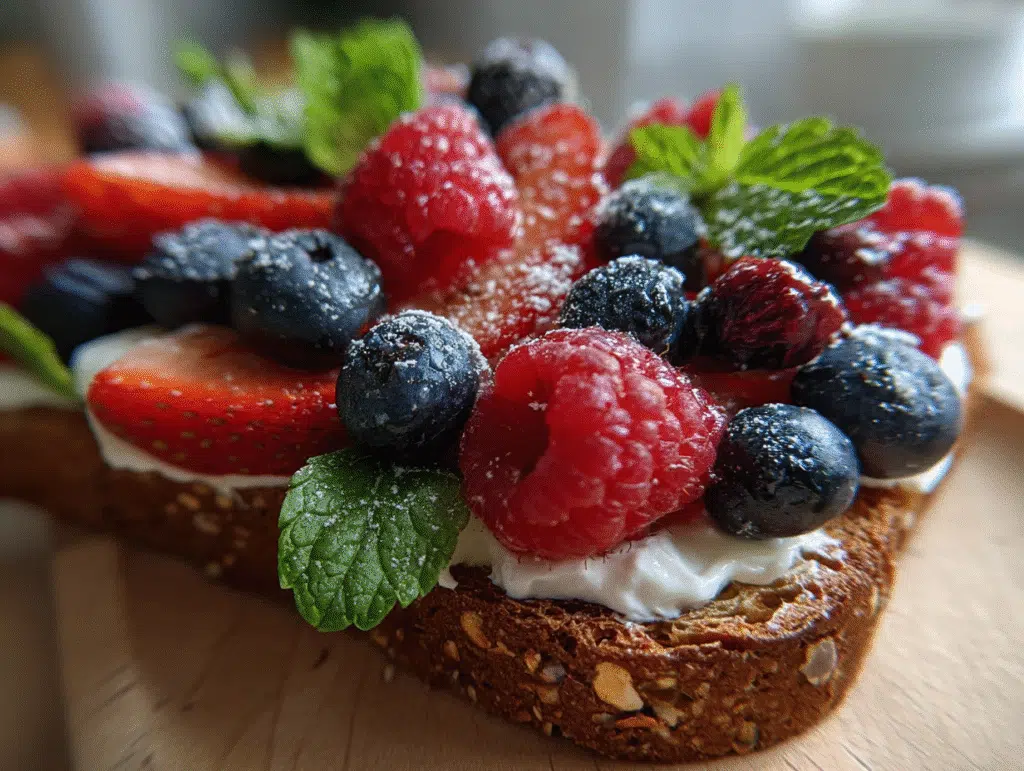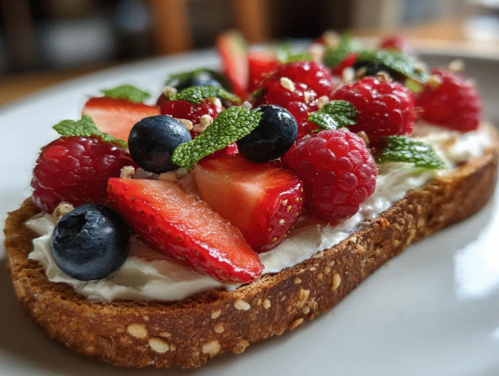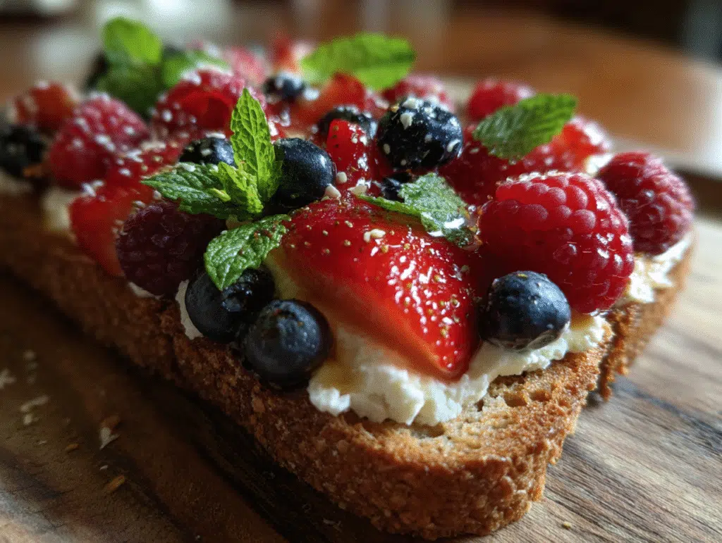 The juxtaposition of the silky mascarpone cheese against the crisp toast creates an incredibly satisfying mouthfeel. Seasonal berries, like ripe raspberries, blueberries, and strawberries, provide a burst of juicy freshness and antioxidants while the sprinkle of mint leaves adds a subtle herbal note, making every bite feel gourmet.