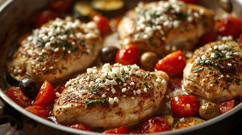 With juicy cherry tomatoes, thinly sliced zucchini, red onions, and aromatic garlic, this bake becomes a celebration of freshness. The chicken absorbs the rich flavors of oregano, basil, and olive oil, transforming into a tender, savory centerpiece. Topped with creamy feta and melted mozzarella, each bite offers the perfect balance of texture and Mediterranean comfort.