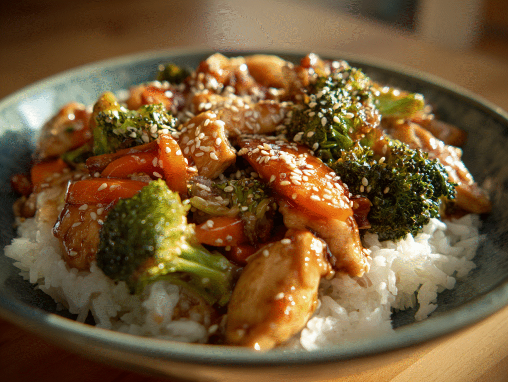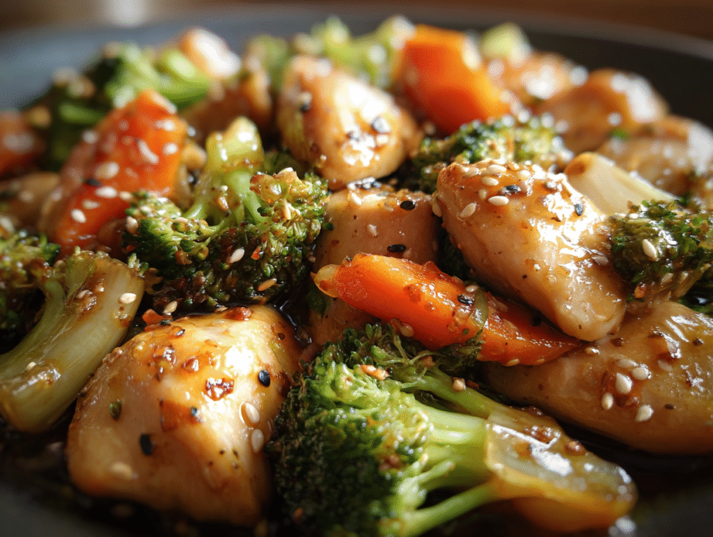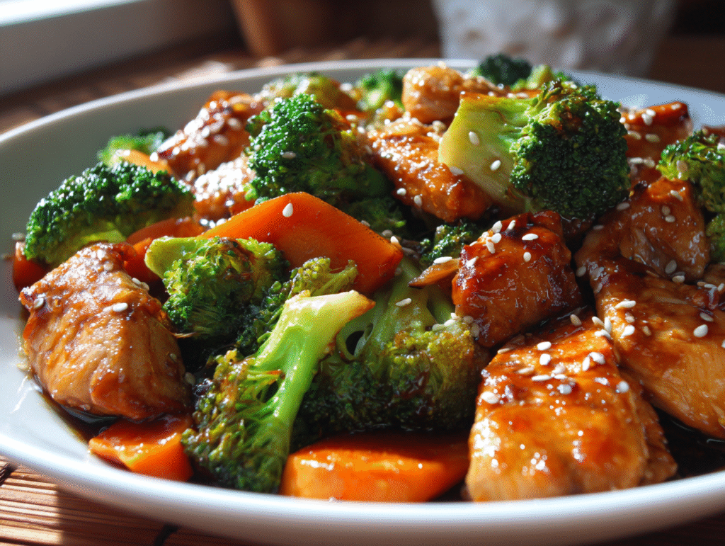 You’ll start by sautéing bite-sized chicken breast pieces until golden and tender. Then, toss in fresh broccoli florets and thinly sliced carrots for color and crunch. The magic happens when you pour over the glossy sauce — a perfect harmony of honey, garlic, soy sauce, and a touch of ginger — transforming the dish into a sticky, irresistible masterpiece.