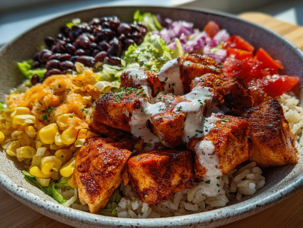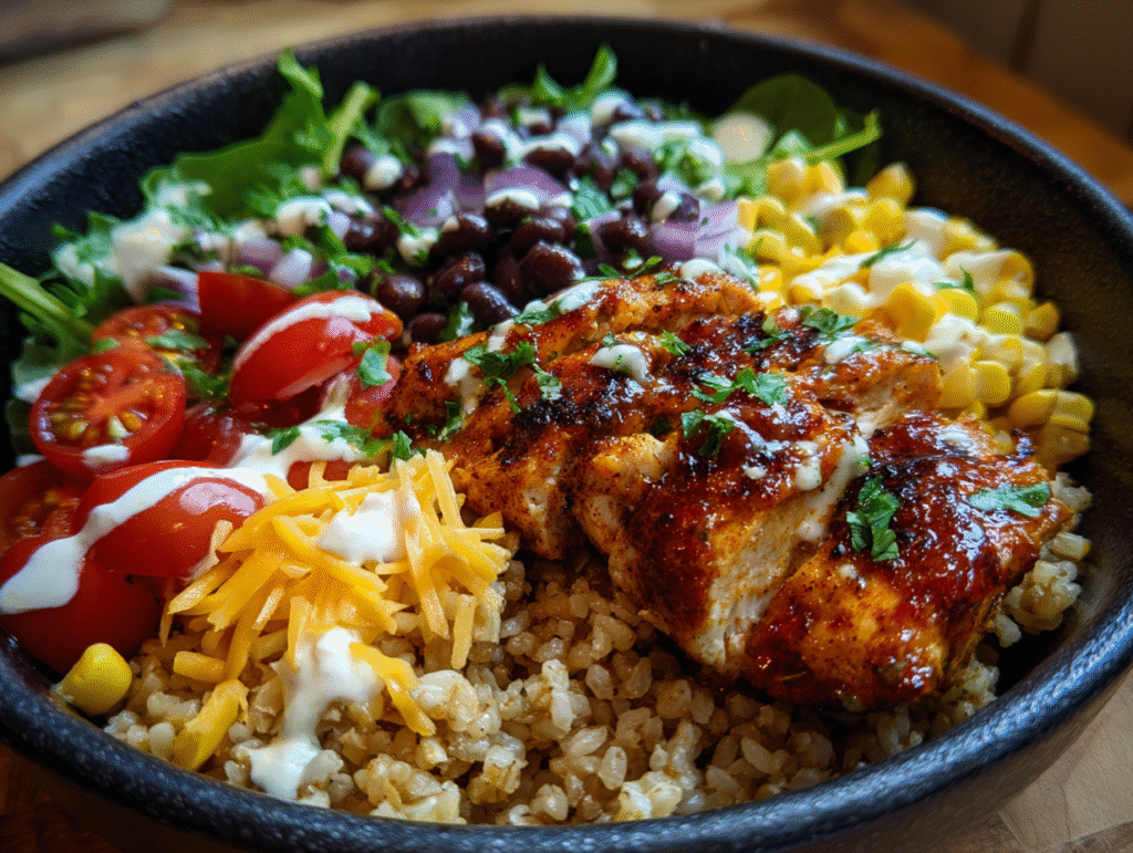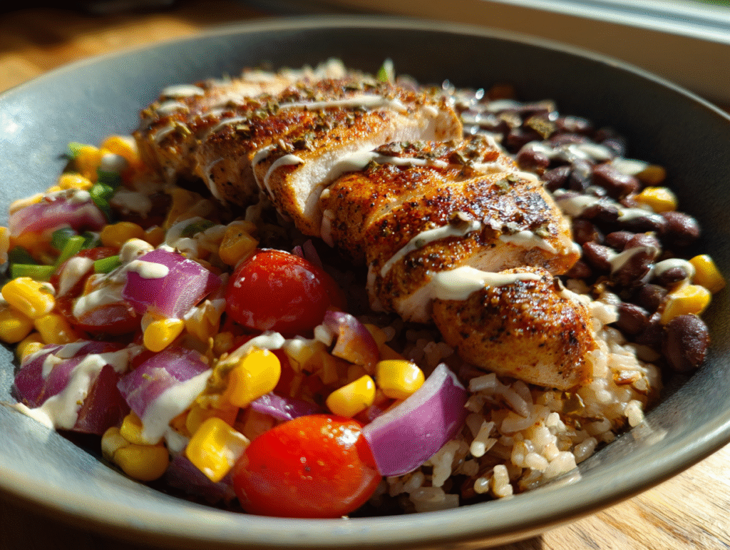 Ideal for busy weeknights or laid-back weekend meals, this bowl uses simple yet satisfying ingredients. Start with tender boneless, skinless chicken breast marinated in olive oil, garlic powder, and smoked paprika. Once grilled to perfection, the chicken adds rich, smoky depth. Combine it with cooked brown rice or quinoa for a hearty base, and layer on fresh corn, black beans, cherry tomatoes, and shredded lettuce or spinach for a nutrient-packed meal bursting with texture and flavor.