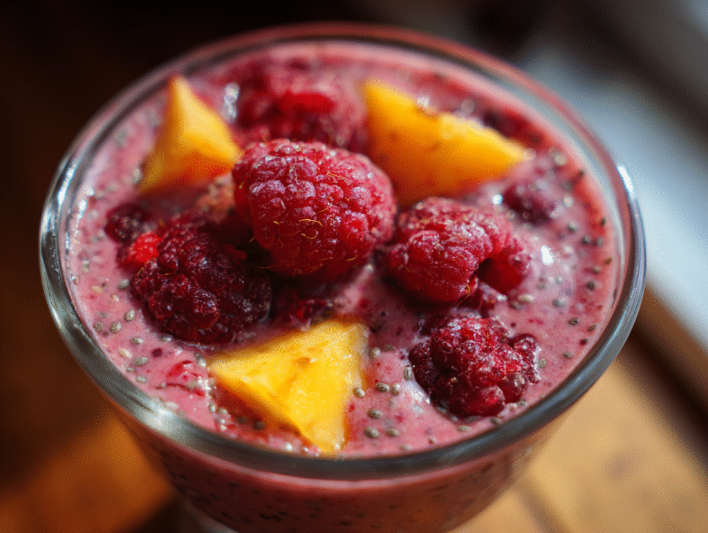 The Raspberry-Peach Chia Seed Smoothie captures the essence of summer in a glass. With its bright color and fruity aroma, it’s both visually inviting and deeply satisfying. The combination of frozen raspberries and peaches gives it a naturally thick and frosty texture, while soy milk and Greek yogurt add smoothness without overpowering the fruit flavors.