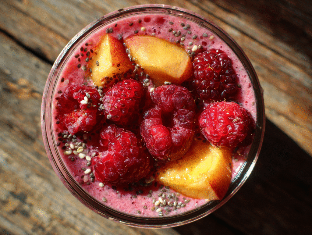 Every glass of this smoothie offers an impressive nutrient profile. Raspberries are loaded with antioxidants, fiber, and vitamin C, which supports immune health and glowing skin. Peaches add potassium and vitamin A, while chia seeds bring omega-3 fatty acids that are essential for heart health.