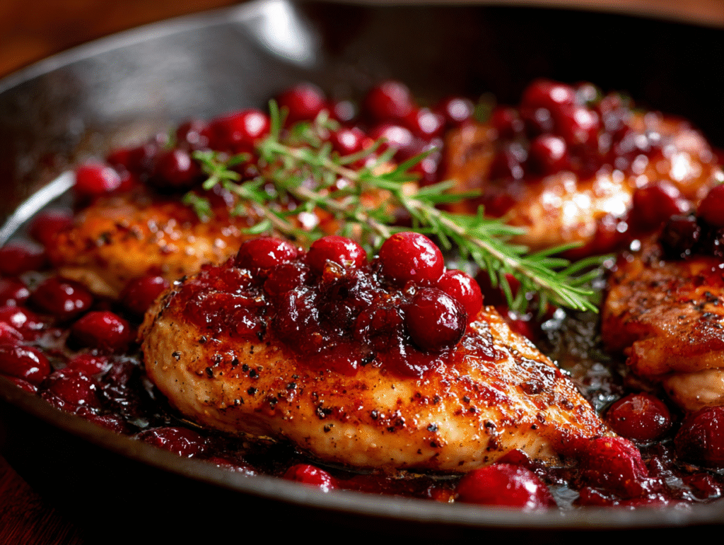 Return the chicken to the skillet and allow it to simmer gently until fully cooked and coated in the glossy cranberry orange glaze. The result is tender chicken infused with bright, seasonal flavor.