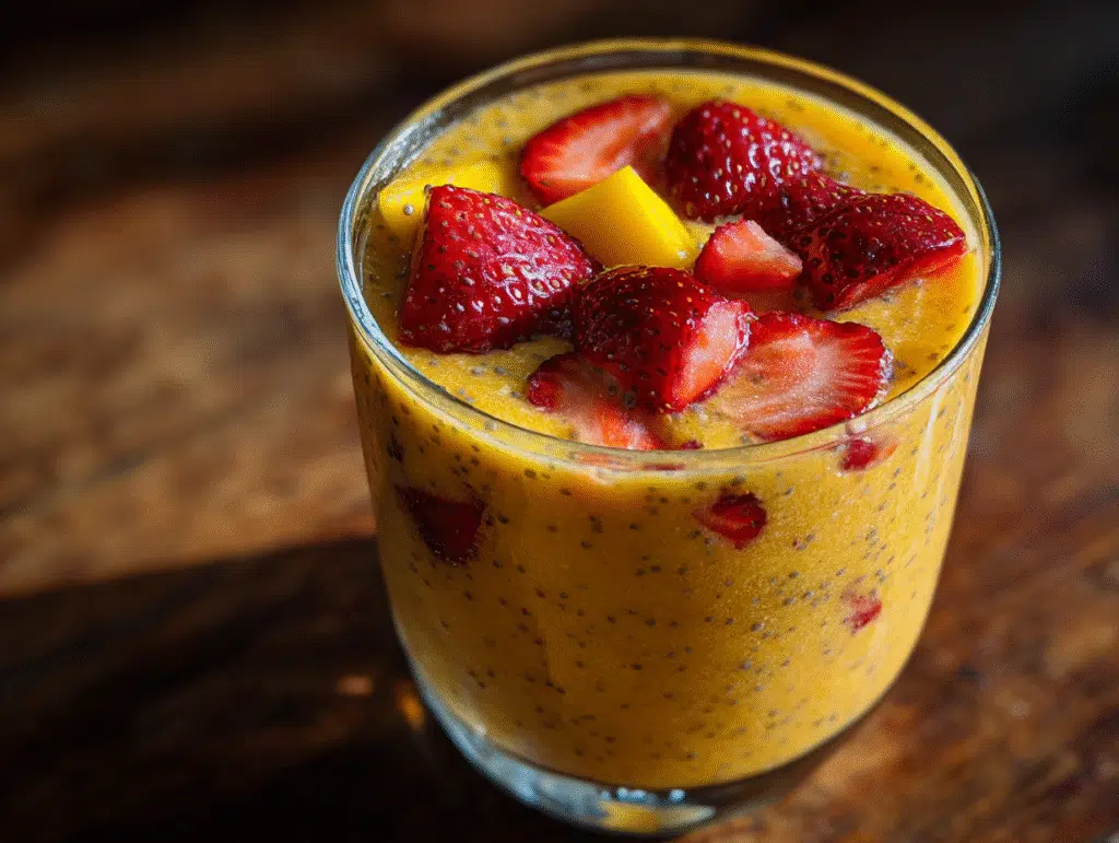 Nutrition Notes: This Strawberry-Mango Chia Seed Smoothie is loaded with essential nutrients. Strawberries provide vitamin C, an antioxidant boosting your immune system, while mango offers beta-carotene, crucial for skin health. Additionally, chia seeds are a great source of omega-3 fatty acids, fiber, and protein, making this treat a well-rounded option. For more on the health benefits of chia seeds, click here.