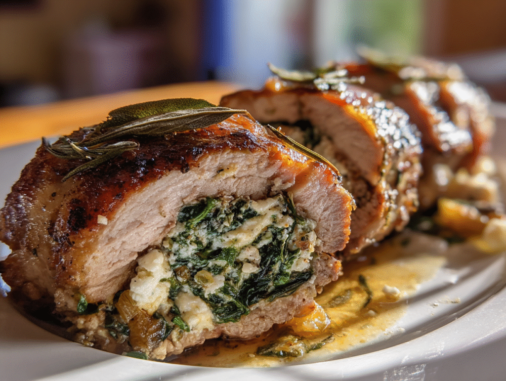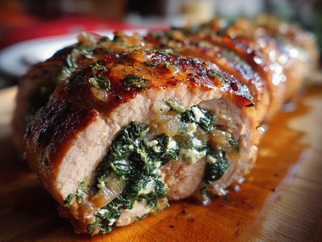 This recipe stands out for its unbeatable combination of textures and flavors. Moist, juicy pork tenderloin is butterflied and rolled around a delicious filling of caramelized onions, wilted spinach, tangy goat cheese, and warm herbs. Finished with a glossy cranberry sauce, each bite brings harmony — savory richness, sweet undertones, herbaceous notes, and a pop of festive brightness. It’s the kind of dish that looks restaurant-worthy but is achievable in your own kitchen without hours of work.